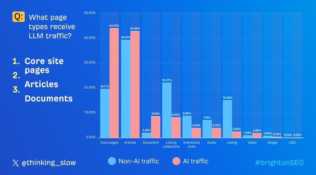 從這些數據來看,大多數引用屬於「核心網站頁面」類別:網站的首頁、價格頁面或關於頁面。這些是網站的關鍵部分,但並不總是搜尋可見度的重要貢獻者。它們對LLM的重要性似乎更大。