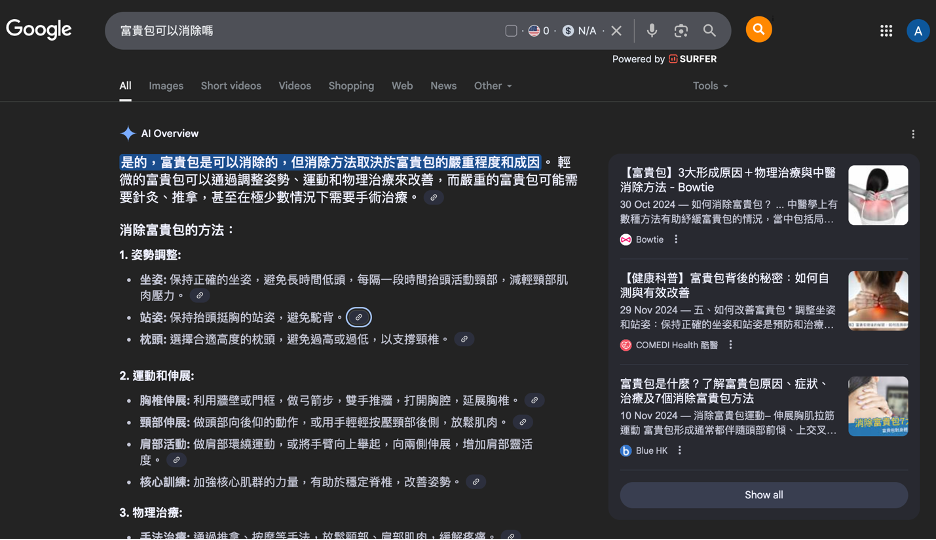 短尾關鍵字(例如「富貴包」)通常意圖模糊,競爭激烈,在AI Overview的籠罩下更難脫穎而出。而長尾關鍵字(例如「富貴包可以消除嗎?」)則意圖明確,通常代表用戶尋求具體答案或解決方案,這正是精選摘要和PAA區塊的目標。